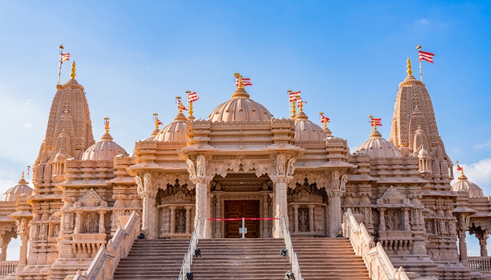 A monumental stone mandir offering spiritual architecture, curated gardens, and community spaces—visitors must pre-register for entry.